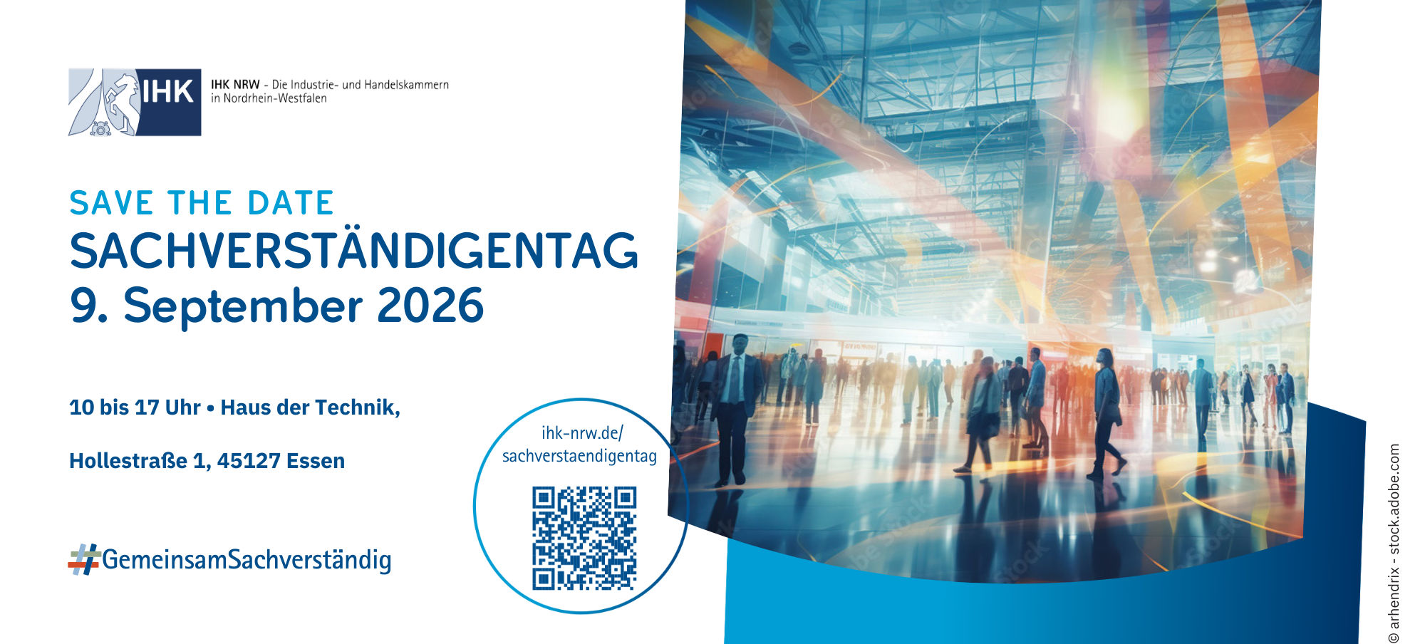 Weitere Informationen, das Programm sowie eine Anmeldemöglichkeit finden Sie in Kürze hier: Sachverständigentag NRW 2026 – Zukunft gestalten, Wissen teilen! - IHK NRW